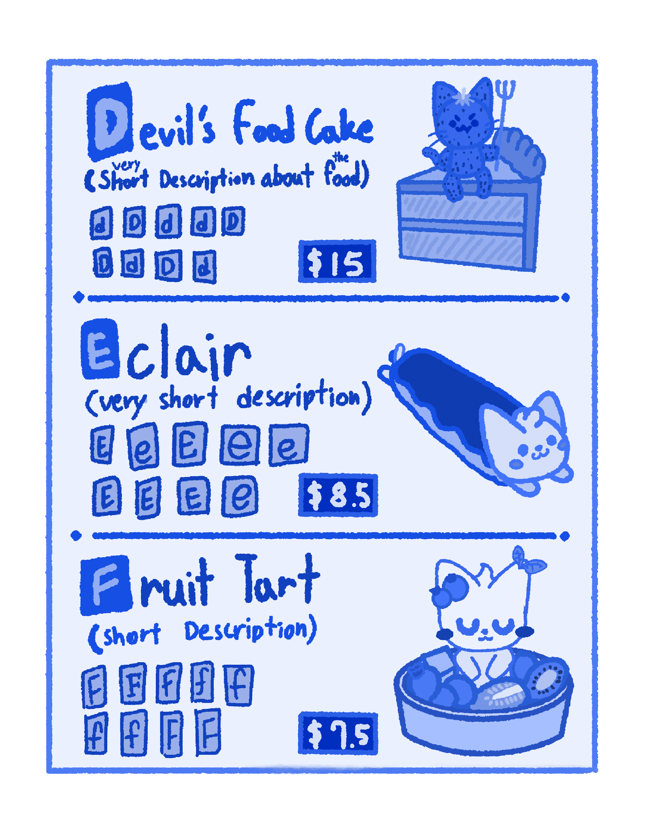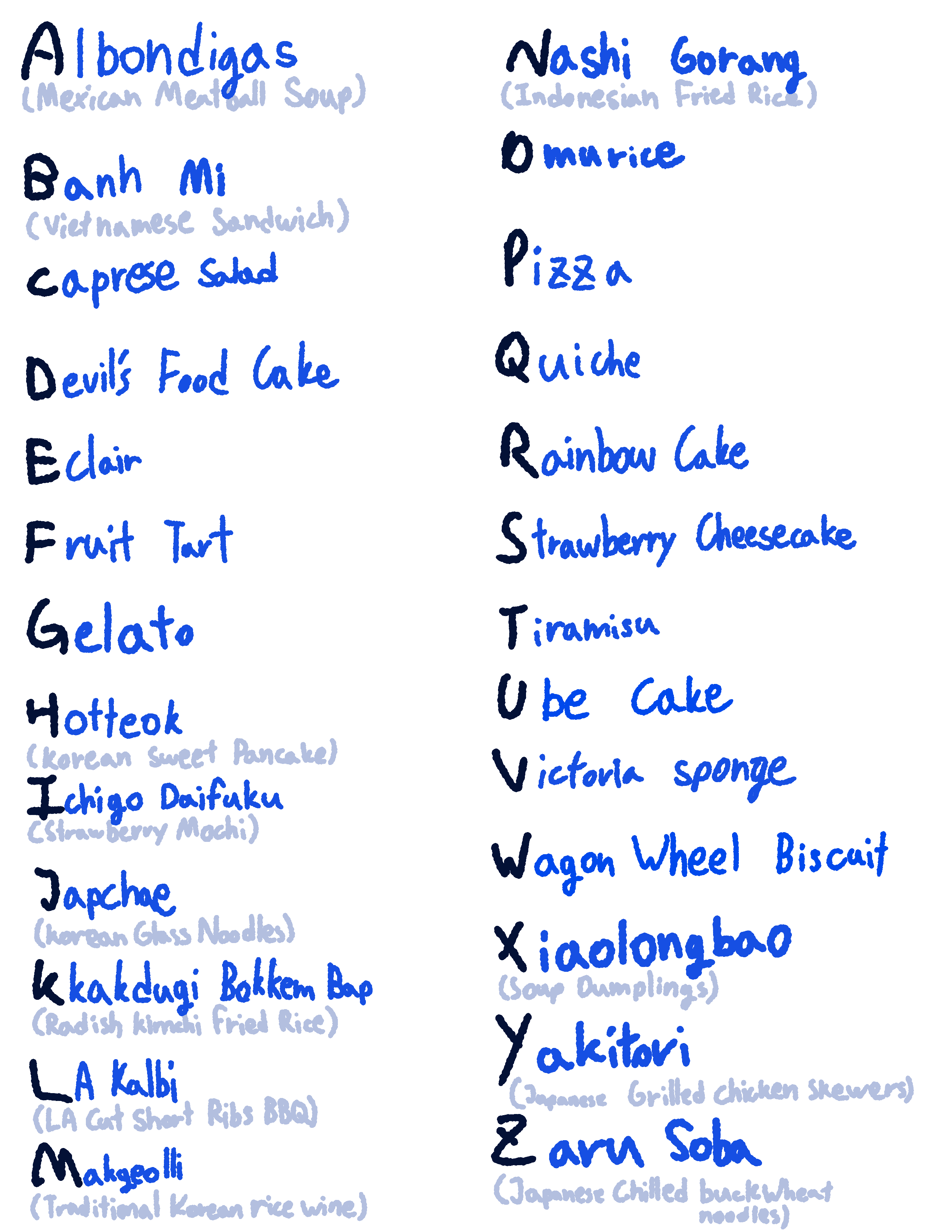For my Typography 1 course, I had to pick a category, identify items in that category, and list those items in alphabetical order. Also, each letter needed to have 10 cutouts from magazines, posters, photos, etc. My category was food, and I decided to display my items like a menu at a restaurant because I love to try different types of foods around the world. In order to mimic current restaurant menus, I decided to make a QR Code where people could scan and see the menu.