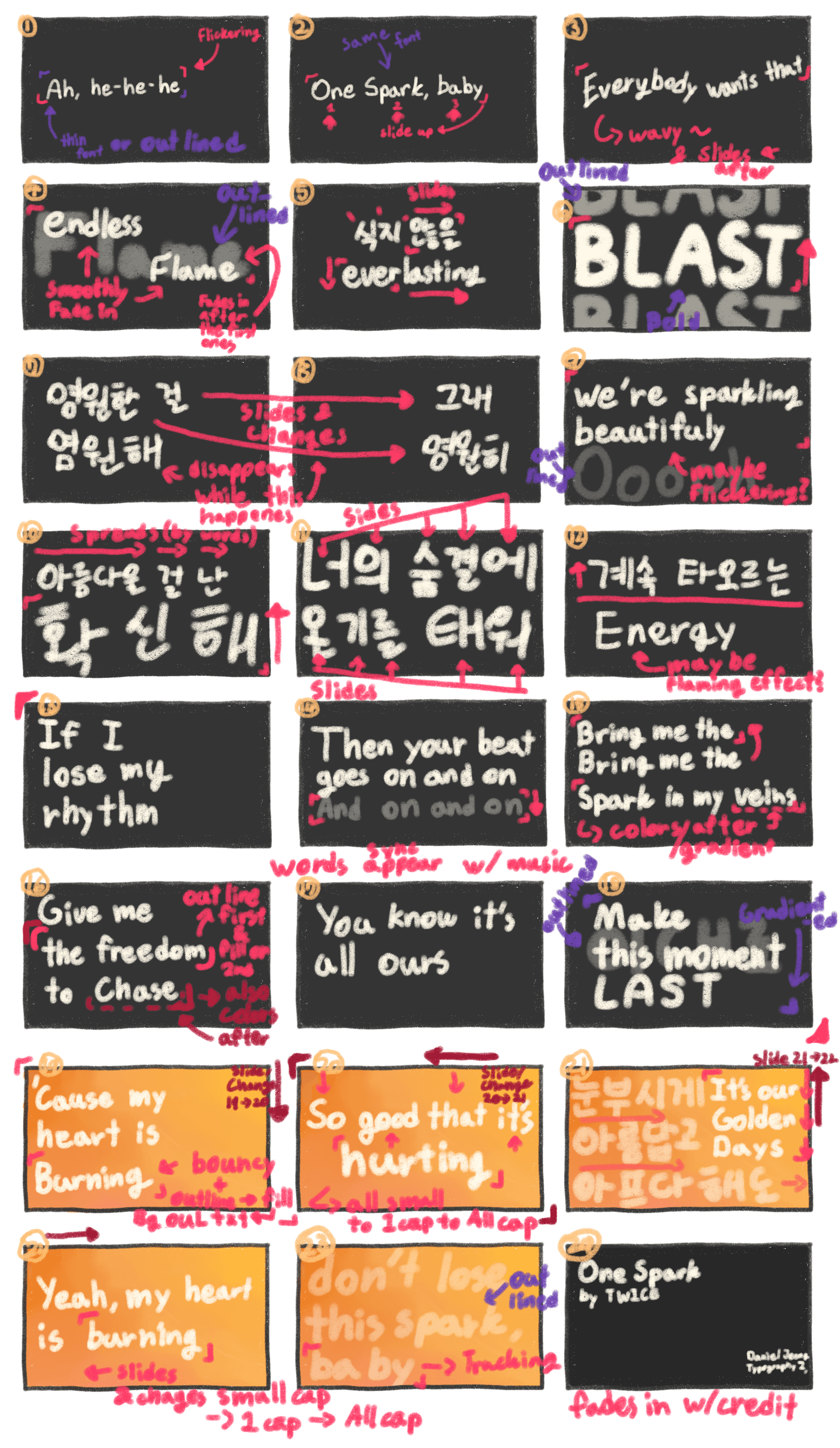 For my Typography 2 course, we were asked to create a kinetic typography video using Adobe After Effects. Although some of my ideas were not entirely feasible with After Effects, I found alternative ways to express my original ideas with one of my favorite Korean pop songs called "One Spark" by Twice.