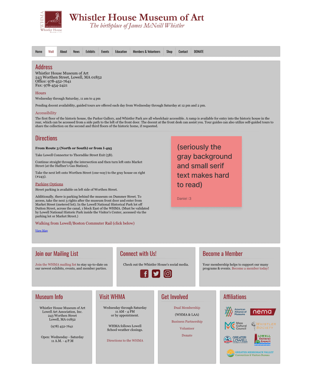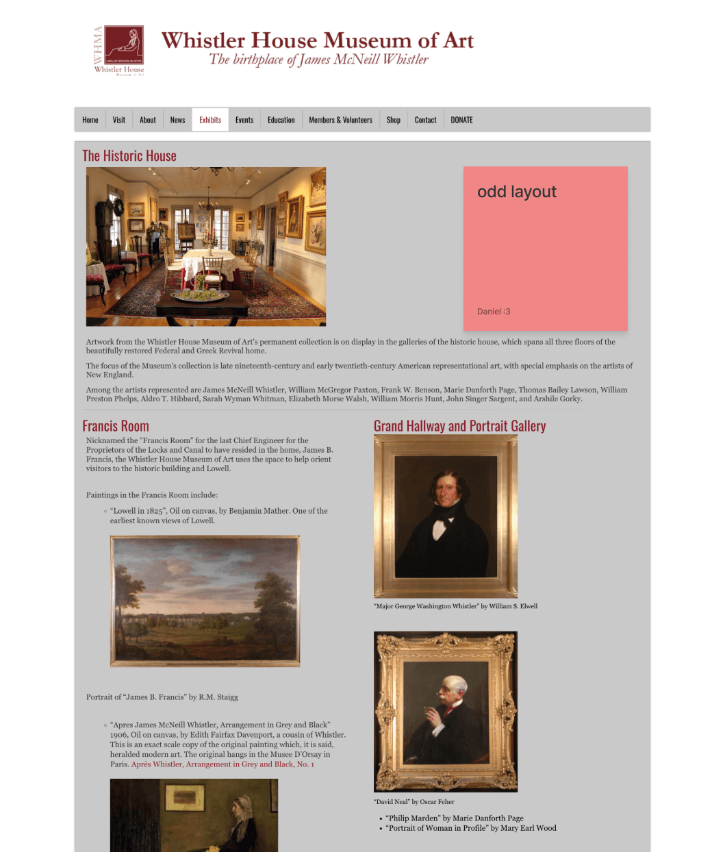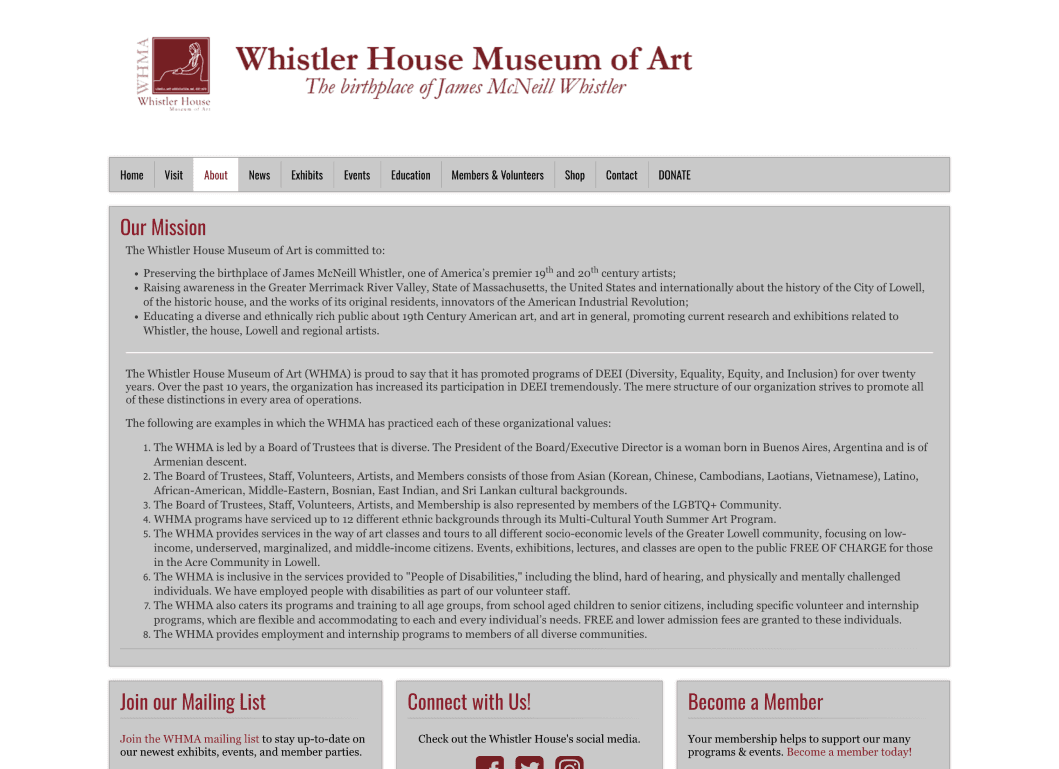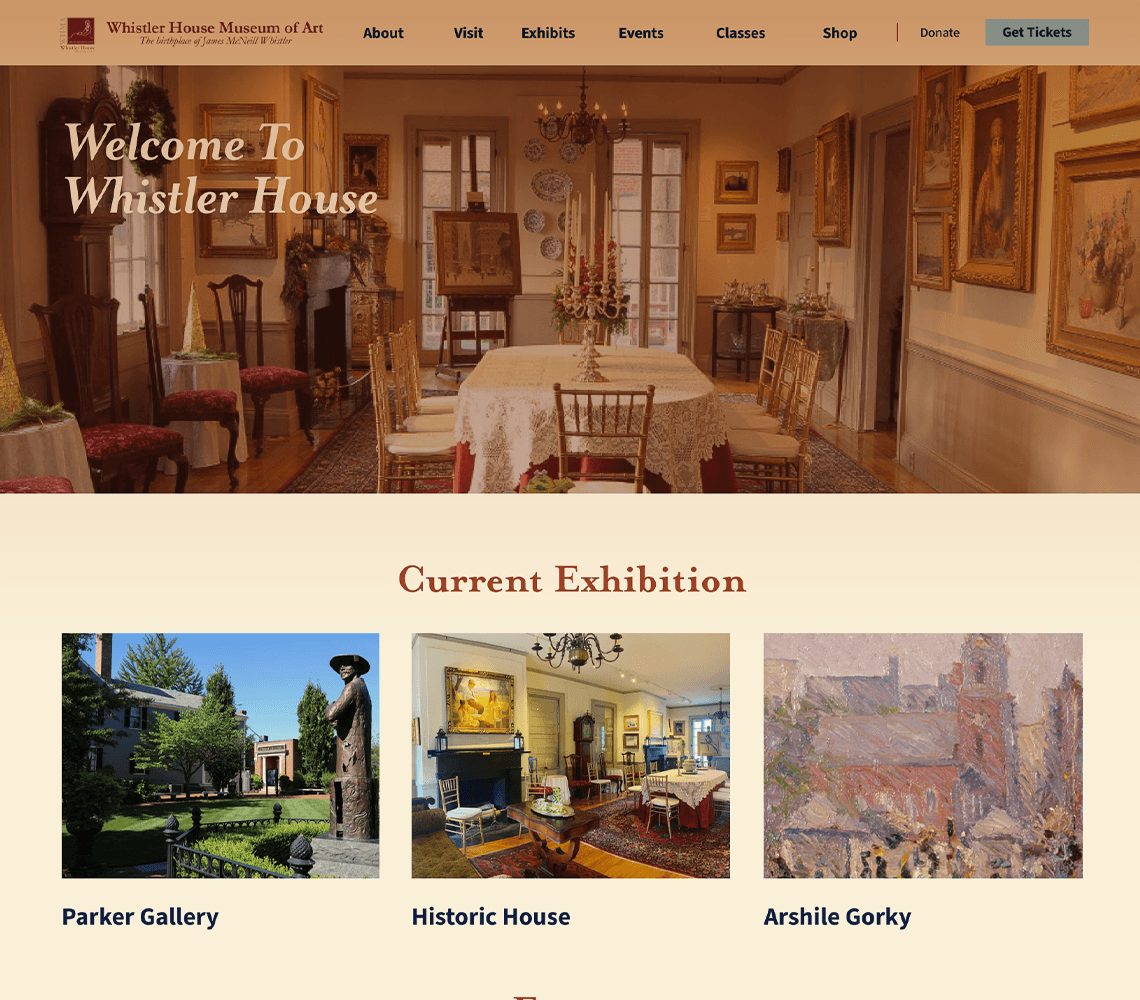For this project, I picked the Whistler House Museum of Art because I felt that the website did not reflect the beauty and essence of the museum. The entire website had all of its text and artwork featured in gray boxes.