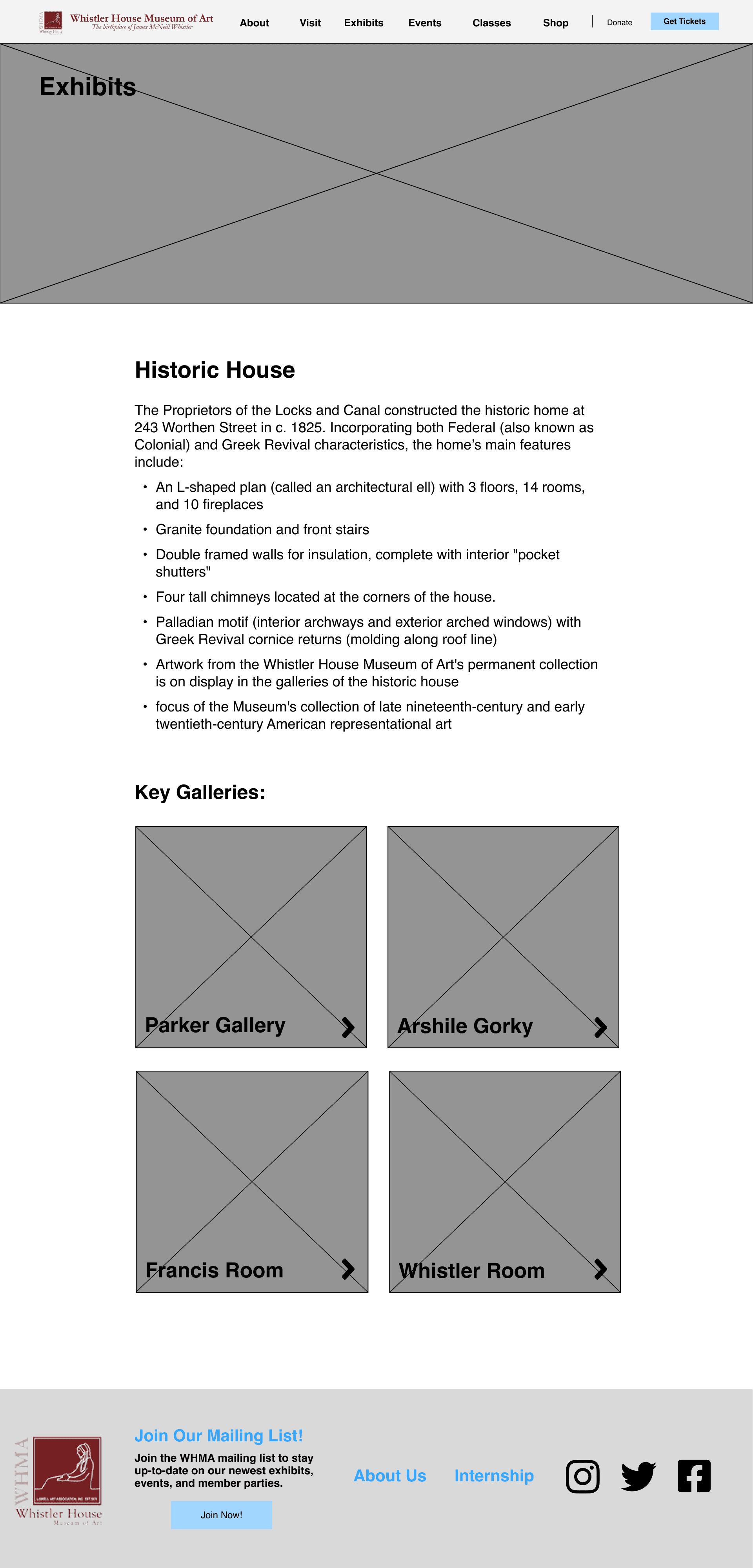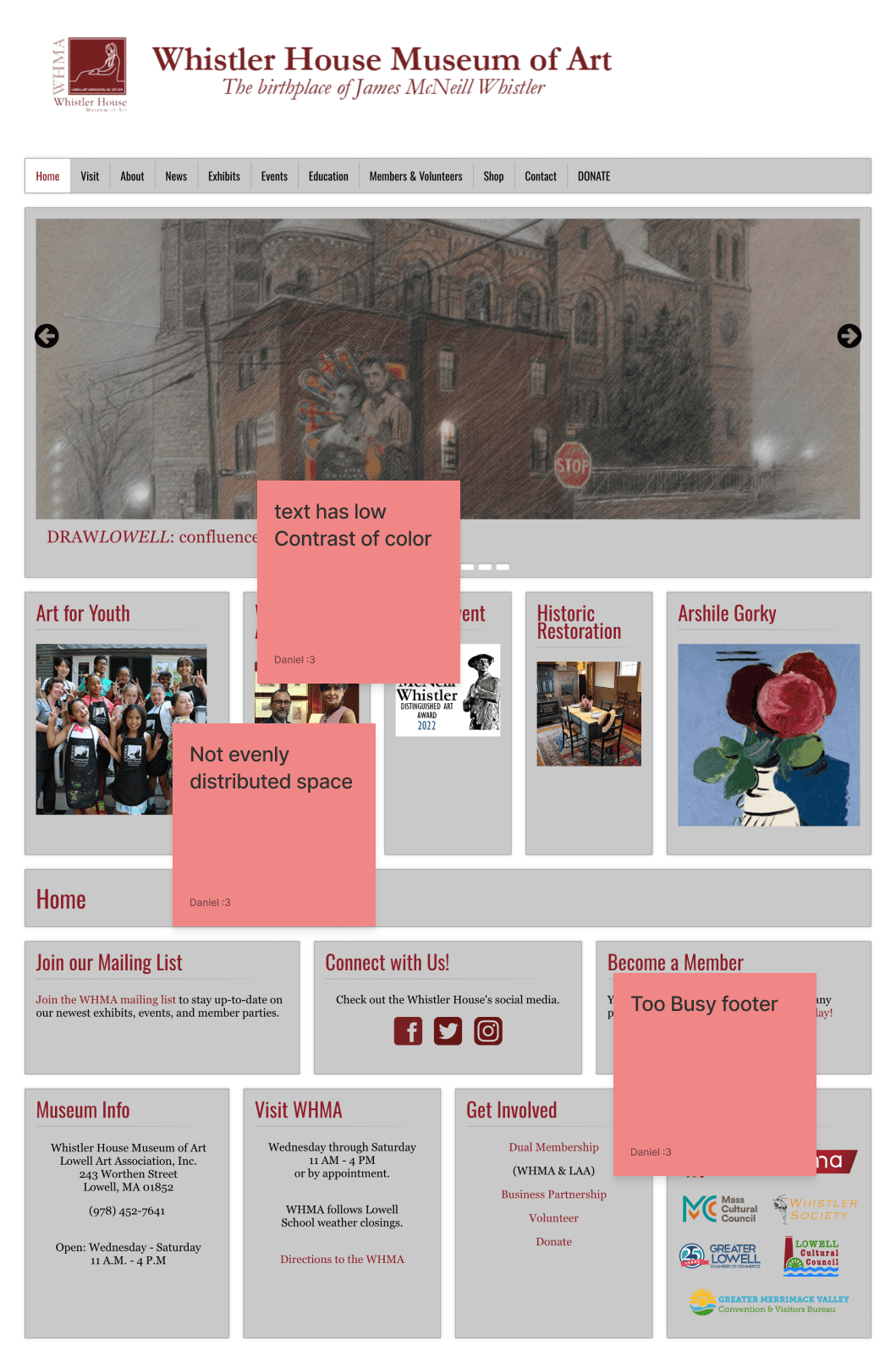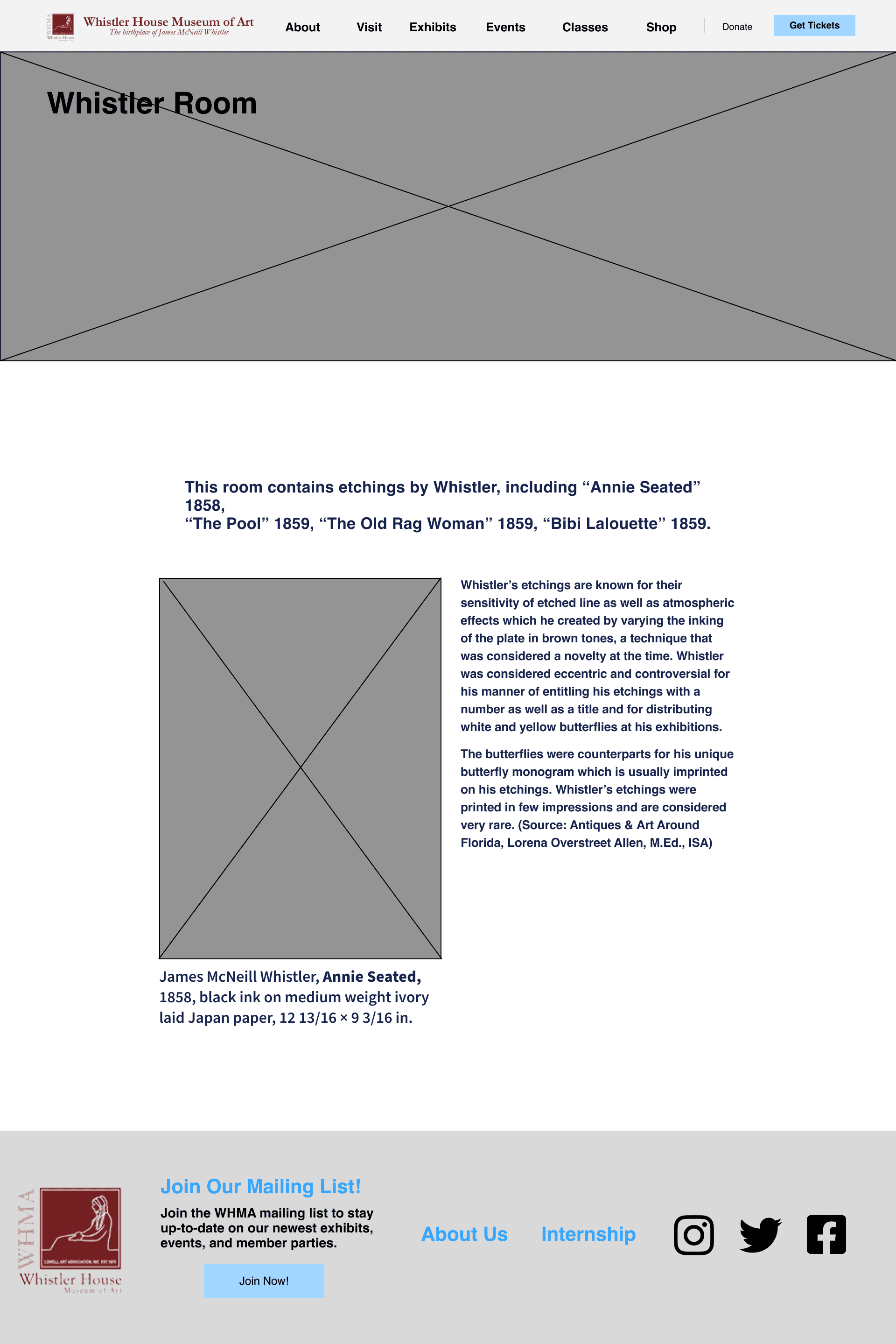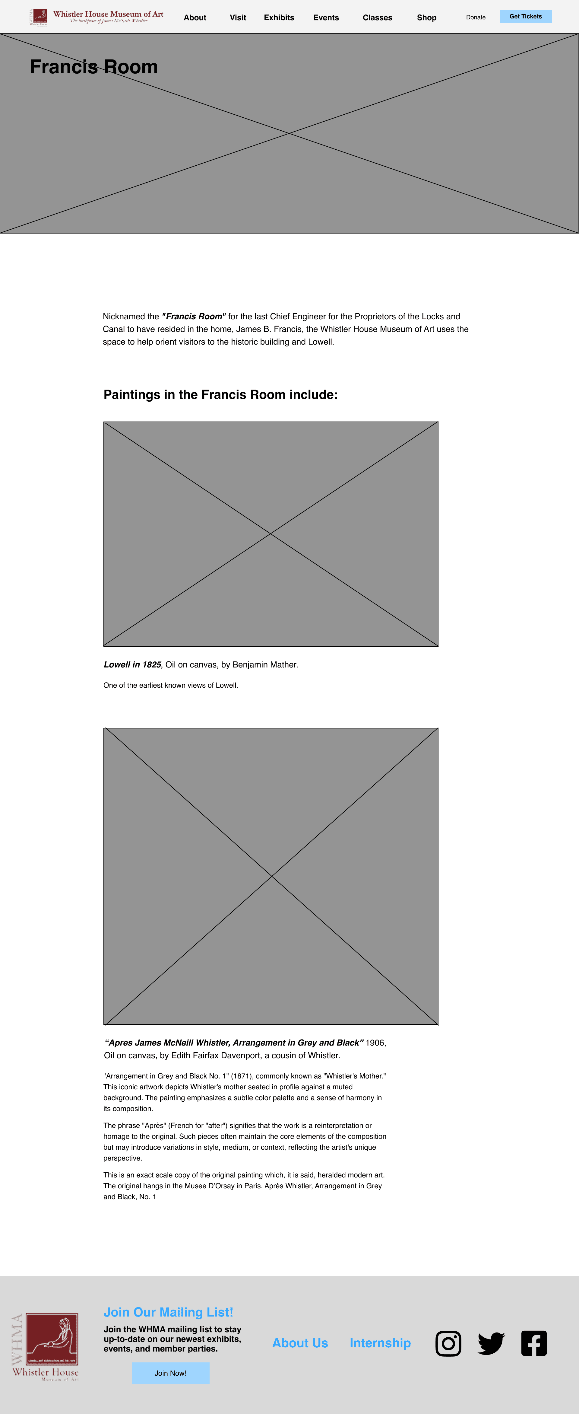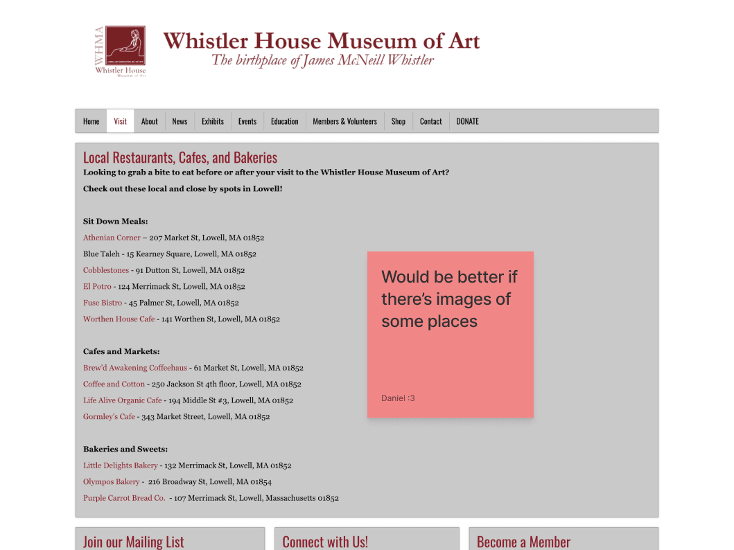 For this project, I picked the Whistler House Museum of Art because I felt that the website did not reflect the beauty and essence of the museum. The entire website had all of its text and artwork featured in gray boxes.