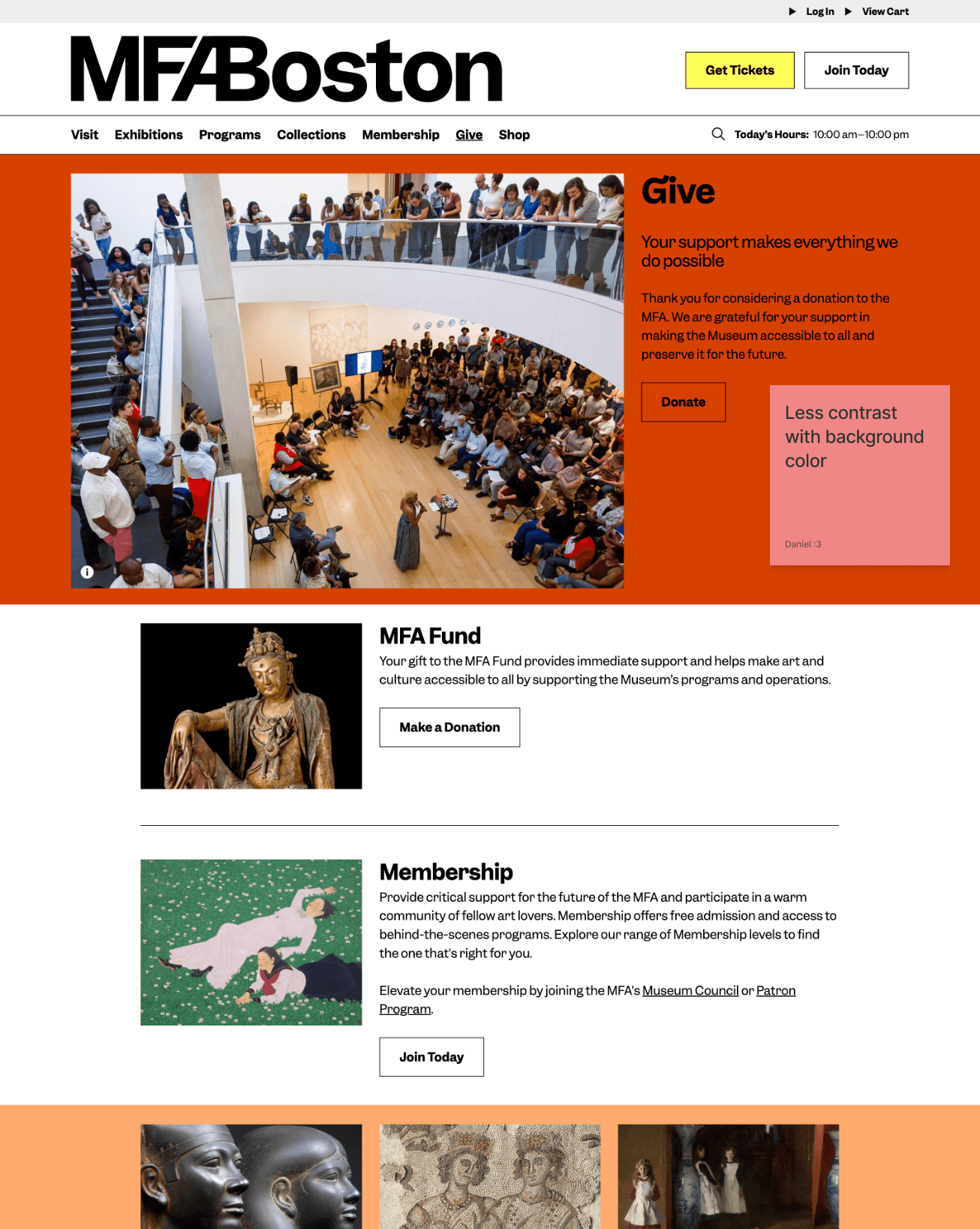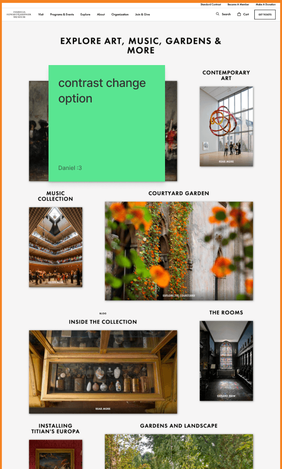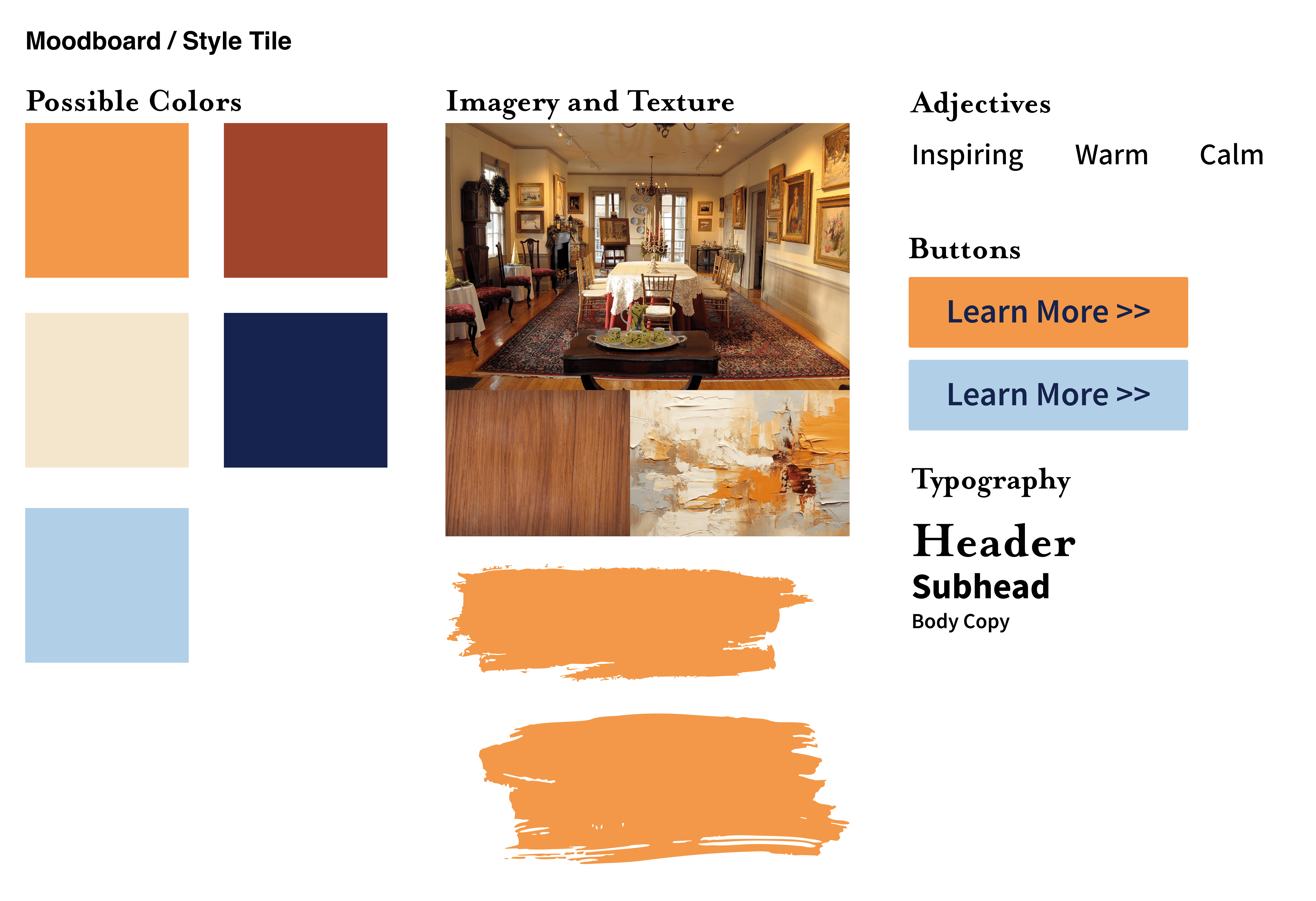 For the MoodBoard, I focused on capturing the warmth of the wood and the color scheme within the museum. I also wanted to incorporate the texture of the paint stroke into the website to help people visualize the paintings and artwork within the museum.