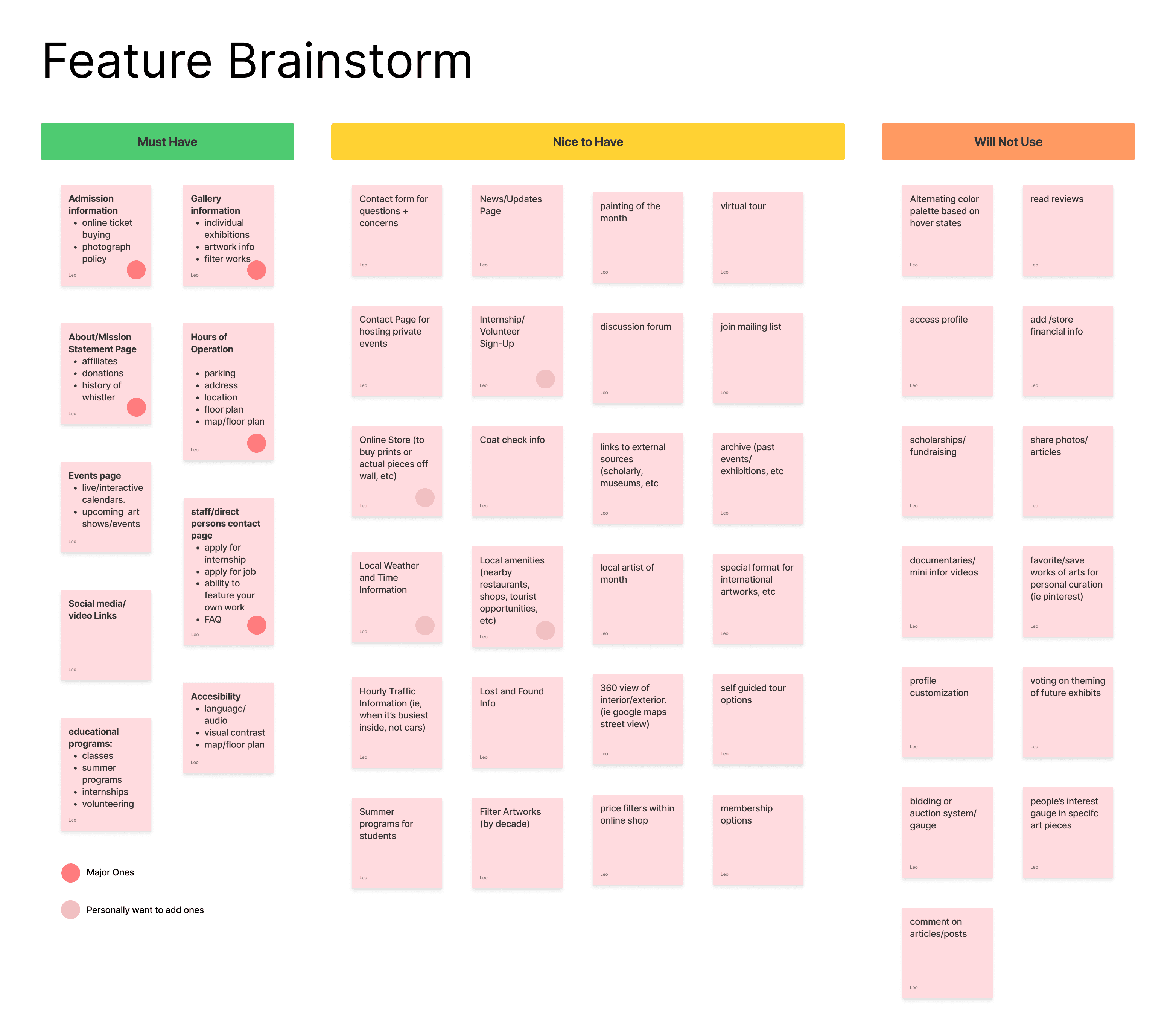 After I finished my research stage, I worked with my classmates to brainstorm different website features that are good for a website to have. Then, we sorted the features into three different groups: must haves, nice to haves, and not needed. Based on our sorting work, I picked the features that would best match my user persona's need. Lastly, I created a site diagram to visualize the design features on the website and to organize how all of the content would connect.